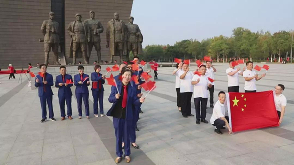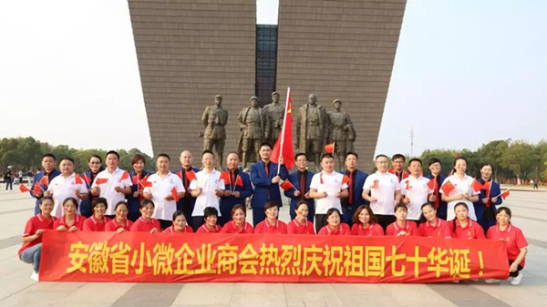 在渡江战役纪念馆南广场,全体人员瞻仰了革命先烈塑像。随后,全体党员展开鲜红的国旗,党旗,在中共安徽省小微企业商会党支部书记、会长许成汉的带领下,高举右拳,重温入党誓词,齐唱了《我和我的祖国》,掷地有声让人肃然起敬,使命感也油然而生。