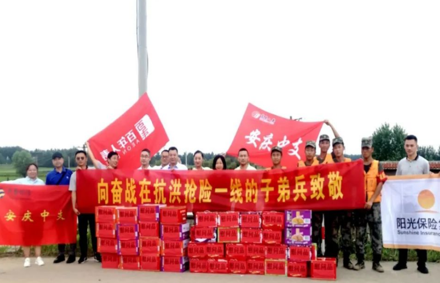 市保险行业协会组织百年人寿、东吴人寿、华泰人寿、阳光财险四家产寿险公司志愿者们,前往安庆江心洲对一线防洪战士进行慰问,并送去牛奶、面包等慰问品,为一线防汛人员打赢防洪战加油鼓劲。