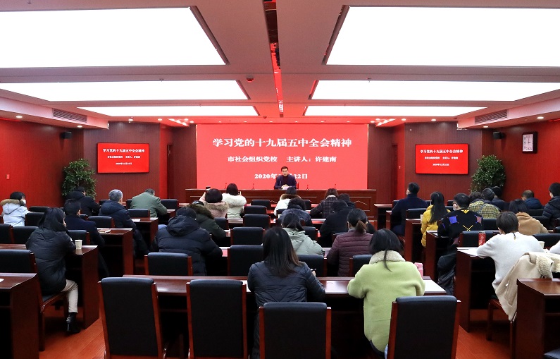 为深入贯彻党的十九届五中全会精神,激发社会组织党组织活力,充实党支部书记、党务工作人员和党员“三支队伍”的政治理论知识,提升社会组织党建工作整体水平,推进社会组织健康有序发展,12月22日下午,安庆市社会组织党校举办第三期学习班,安庆市民政局局属单位党支部成员、市级社会组织党建工作代表共60余人参加了学习会。安庆市民政局副局长、党组成员、安庆市社会组织综合党委书记许建南主讲十九届五中全会精神,并对社会组织党建工作提出要求。