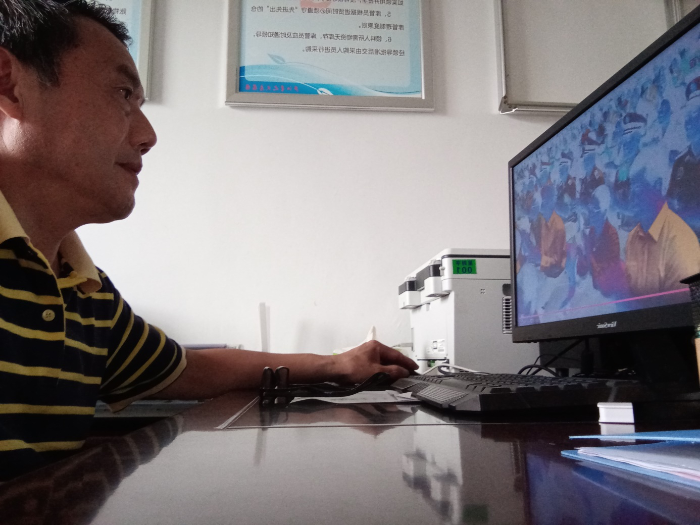 庐江县星之火志愿团党支部党员在各自电脑上收看周年大会。
