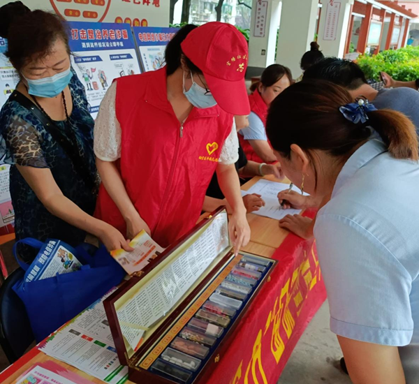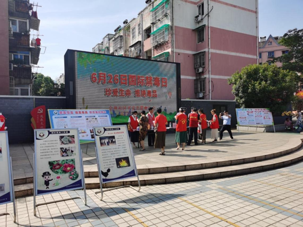 郊区金苑社区平安志愿者协会在金苑社区法治志愿服务广场开展“珍爱生命 拒绝毒品”禁毒宣传,志愿者向广大居民介绍有哪些毒品,如何防御误入毒品圈套,自觉抵制毒品侵害等。