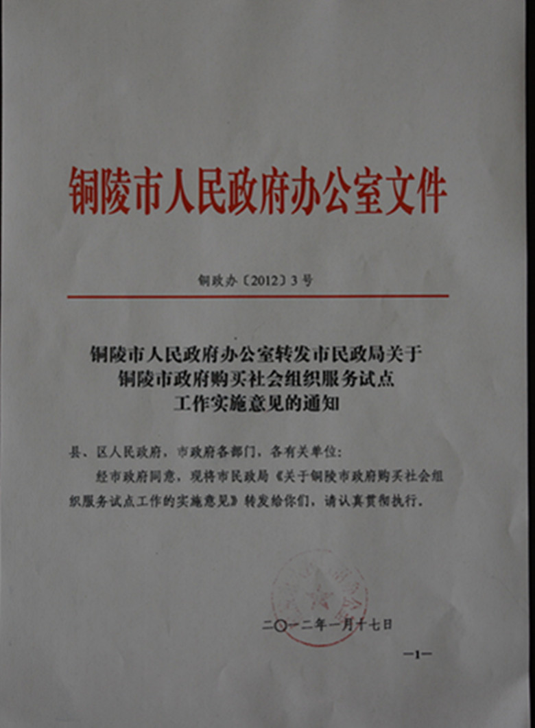 铜陵市政府办公室转发市民政局关于铜陵市政府购买社会组织服务试点工作实施意见的通知