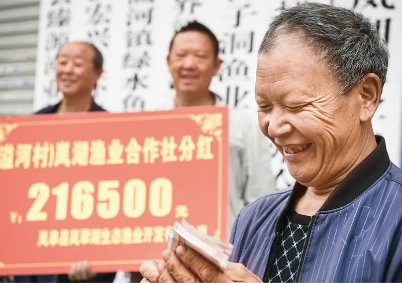 近年来,陕西省安康市岚皋县因地制宜,依托当地优质水资源和鱼类资源,秉承“以水养鱼、以鱼治水、绿色增收、循环发展”的理念,按照“公司+合作社+移民户”的管理模式,通过日常湖面管理、统一订单销售、零售以及年底分红等方式,带动当地渔民增收致富。图为2020年5月11日,在岚皋县溢河村岚湖渔业合作社分红会上,村民领到自己的分红。新华社记者 陶明/摄