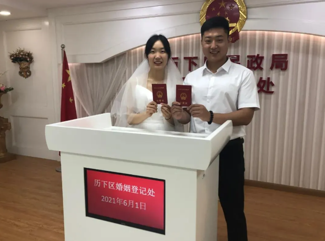 2021年6月1日早上,天津市户籍的刘先生和河北省秦皇岛市户籍的杨女士,在山东省济南市历下区婚姻登记处领到了“跨省通办”结婚证。这是婚姻登记“跨省通办”试点工作正式实施后,全国颁发的第一张“跨省通办”结婚证。中国社会报记者 周冉冉摄