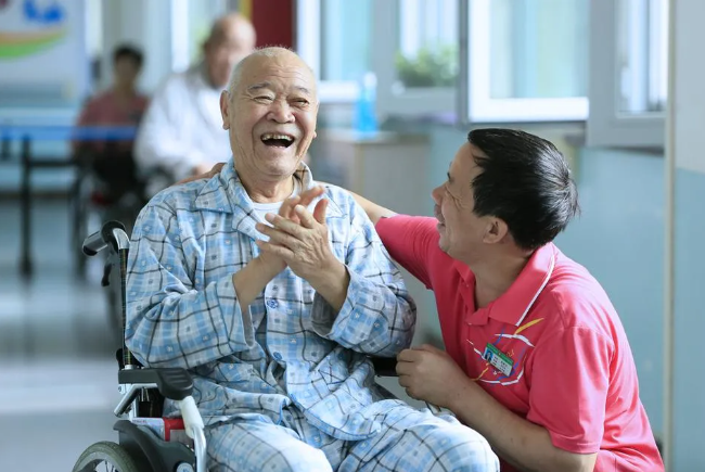 新疆乌鲁木齐市养老福利院金牌男护理员、乌鲁木齐市劳模黄跃宗正在为休养老人悉心服务。(乌鲁木齐市养老院供图)