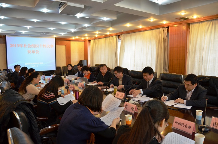 发布会介绍,为了更好地盘点社会组织改革发展过程中的大事要情,从2008年开始,民政部民间组织管理局联合清华大学NGO研究所、北京大学非营利组织法研究中心、国家行政学院社会与文化教研部、中国社会报、《中国社会组织》杂志、中国社会组织促进会等科研机构、新闻媒体和社会组织,开展了年度社会组织十件大事的评选工作。坚持“突出重要性、注重导向性、兼顾全面性”的评选原则,对社会组织领域的重大方针政策、标志性事件、发展成果等进行集中展示,在扩大社会组织影响力、增进社会各界对社会组织了解、改善社会组织发展环境等方面取得了很好的效果。“2013年社会组织十件大事”的评选工作从2013年11月份开始,采取自下而上推荐方式,由上述评选单位和各省、自治区、直辖市,新疆生产建设兵团,各计划单列市民政部门广泛推荐候选事件,之后在评选单位内部进行了投票评选,最终确定了名单。