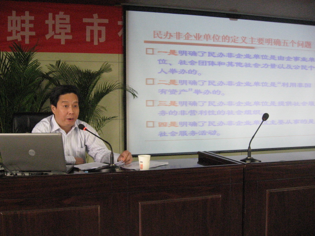 2011年5月5日上午,蚌埠市举办社会组织登记管理培训班,市、县(区)登记管理机关、业务主管单位的登记管理工作者及部分社会组织负责人数十余人参加了培训。