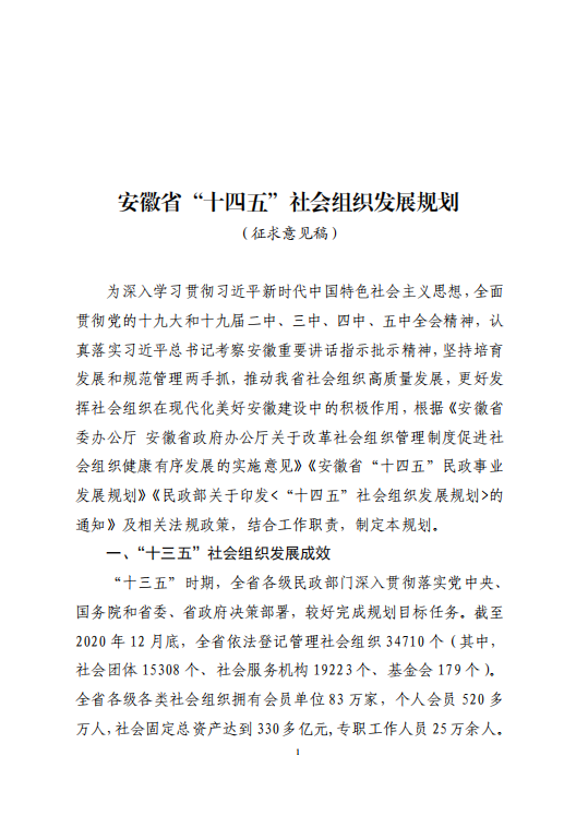 《安徽省“十四五”社会组织发展规划(征求意见稿)》公开征求意见