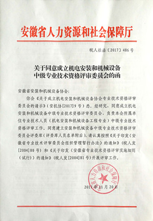 2017年11月30日,安徽省安装和机械设备协会收悉省人力资源和社会保障厅《关于同意成立机电安装和机械设备中级专业技术资格评审委员会的函》(皖人社函【2017】486号),批文同意在安徽省安装和机械设备协会成立机电安装和机械设备中级专业技术资格评审委员会。安徽省安装和机械设备协会成为安徽省唯一一家获得职称评审资格的行业协会。