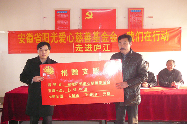 1月9日上午,安徽省阳光爱心慈善基金会“我们在行动——走进庐江”活动在同大镇新河村举行。安徽省阳光爱心慈善基金会会长、安徽德通投资管理有限公司总经理何卫祥先生一行,为同大镇新河村朱德仕等26户贫困家庭捐赠3万元扶贫济困资金。在这寒冷的冬天,在2013年春节即将来临之际,送来了社会的关爱,送来了人间的真情,使新河村老百姓倍感温暖,部分受捐群众流下了感激的眼泪。