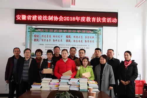 随后,安徽省建设法制协会向该校捐赠了价值三千多元的图书,并向品学兼优的贫困学生捐赠了6000元助学金,勉励他们要努力学习,用优秀成绩回报社会。