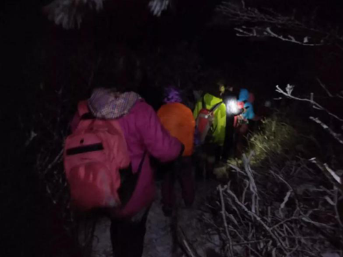 经过了3个多小时的跋涉,根据预判的搜救地点,晚上23时左右,救援队和当地派出所民警终于找到了迷路的40名游客。在清点人数并确定没有伤员后,所有人员在救援队的带领下,越过湿滑泥泞的台阶和乱石,一步一步向山下撤退。