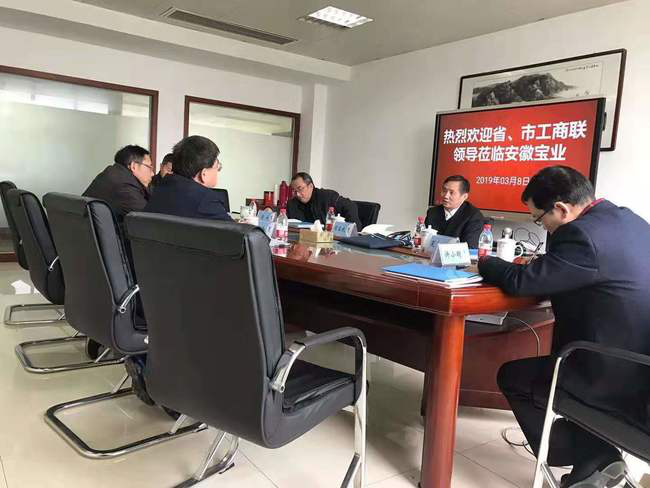 2019年3月8日,安徽省工商联党组成员、副主席司应武一行来到安徽省浙江商会会长单位安徽宝业建工集团调研企业运行情况。安徽宝业建工集团党委书记、副总经理杨忠命,合肥中宝机械制造有限公司总经理孙磊陪同调研。