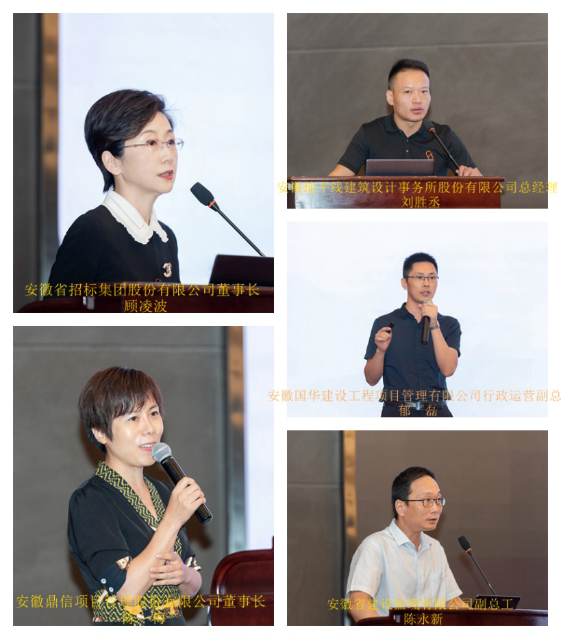 大会进行了企业交流发言,邀请了安徽省招标集团股份有限公司、安徽国华建设工程项目管理有限公司、安徽地平线建筑设计事务所股份有限公司、安徽省建设监理有限公司、安徽鼎信项目管理股份有限公司五家代表性的企业分享了他们开展全过程咨询业务的经验。