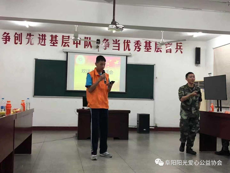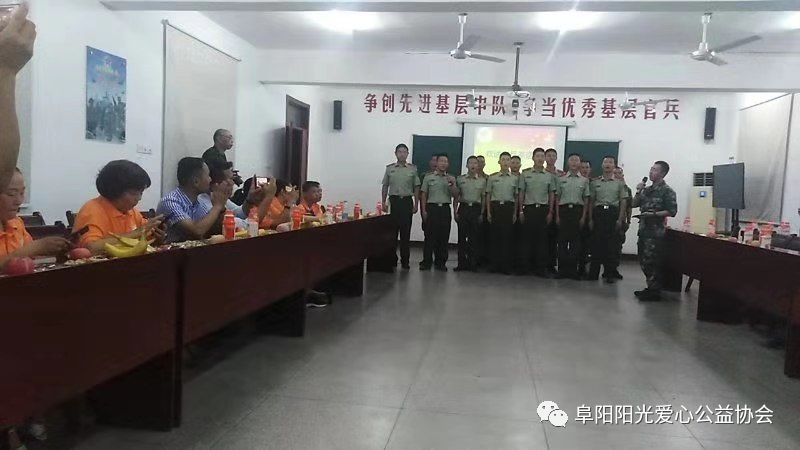 8月,是收获的季节,也是我们最可爱的人,军人老兵完成服役任务,退伍返家建设家乡的日子,为了感谢他们,感谢退伍军人在阜阳服役期间做出的贡献,8月31日晚上8-10点, 阜阳阳光爱心公益协会的志愿者们来到了阜阳武警某中队,与退伍军人欢聚一堂,议军情、话友谊。
