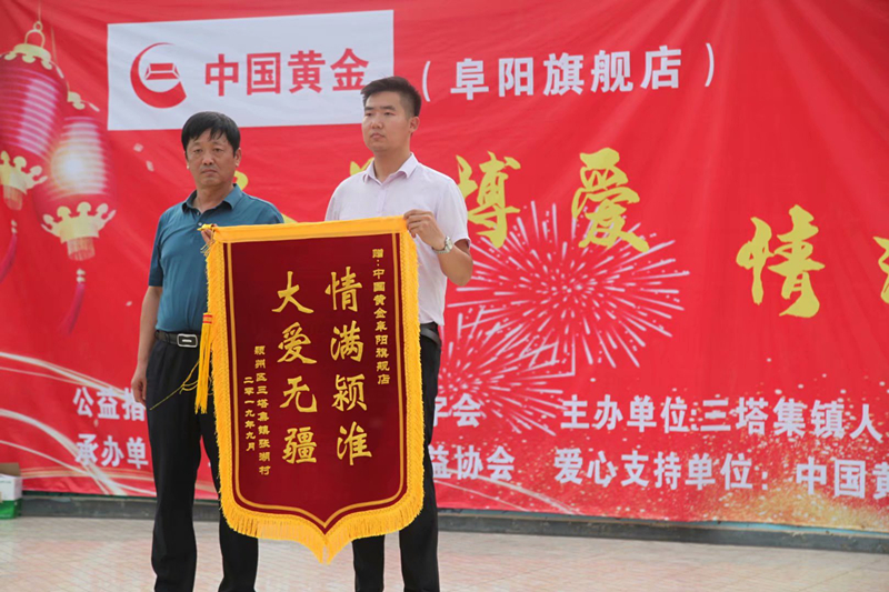 慰问演出现场,三塔集镇党委书记陈祥军、张湖村党总支书记秦少标对指导本次活动的区红十字会,承办单位阜阳阳光爱心公益协会和爱心企业中国黄金阜阳旗舰店表示感谢,三塔集镇党委书记陈祥军和副镇长李文宇对爱心企业进行了授牌。