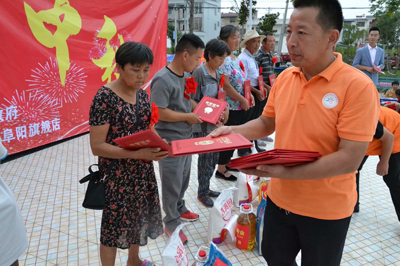阜阳阳光爱心协会会长谢尚斌为受表彰的村民颁发奖品和荣誉证书
