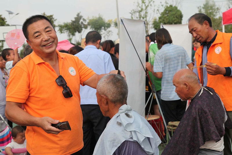 志愿者王冠军大哥正在慰问现场为村民义务理发