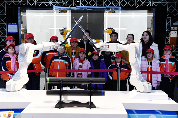 在创智慧展区,更多的创新成果让孩子们目不暇接。蚌埠玻璃工业设计研究院研制的0.12毫米超薄玻璃,不仅超薄程度世界第一,韧性和强度也非常出色,现场展示的0.12毫米玻璃弯曲,让孩子们很难相信“玻璃也可以这样”!随之而来的机器人,更受到孩子们的“追捧”,舞剑机器人的精彩“表演”惹来阵阵掌声。