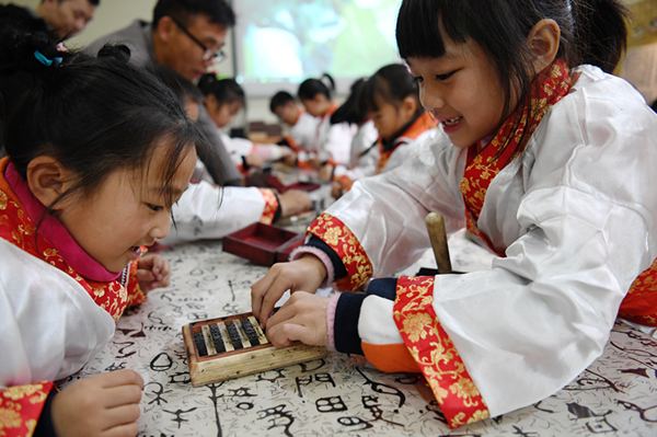 当天下午,志愿者带领孩子们来到字迹活字印刷体验馆,让孩子们身着汉服体验古代智慧结晶——活字印刷,学习古诗词活字印刷过程以及装裱,并留下纪念书签。在工作人员指导下,同学们每两人一组,使用铅活字进行古诗词印刷比赛。古诗词大多是同学们学过的,但对初次接触反向铅字孩子们来说,完整地拼出一首古诗并不容易。上初中的童惠敏同学手脚麻利,很快拼出《绝句》“两个黄鹂鸣翠柳,一行白鹭上青天……”其他同学也不甘示弱,《寻隐者不遇》“松下问童子,言师采药去。只在此山中,云深不知处。”很快被黄波同学拼好。最后,同学们还将自己的姓名印在了纸上,连同诗词装上画框,喜欢极了,一个个小心翼翼地将自己的作品装进书包里。