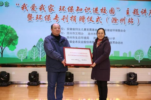 1月3日下午,由安徽省妇女儿童发展基金会、安徽省环保联合会主办,滁州市文明办、市妇联、市生态环境局、湖心路小学承办,安徽金禾实业股份有限公司、家教世界杂志社协办的“我爱我家环保知识进校园”主题讲座暨环保专刊捐赠仪式(滁州站)在滁州市湖心路小学知儒堂举行。