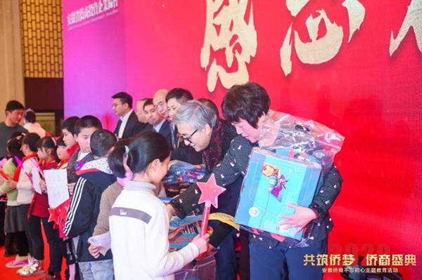 侨商在发展事业的同时,不忘社会责任,他们关注教育、关注孩子。活动第二篇章“感恩篇”,在孩子们“感恩的心”的歌声中开始,十几个被资助的孩子们被请到会场,他们把心愿画在图画中送给资助支持他们的方徽琴会长、叶志一会长、王邦侃会长、君豪会长、王康宁会长、唐涛会长、王永山会长、高远会长。会长们向孩子们赠送了新年的学习礼物。会长们倡议全社会给孩子们更多的关注和关爱,让他们能更好地健康快乐成长。
