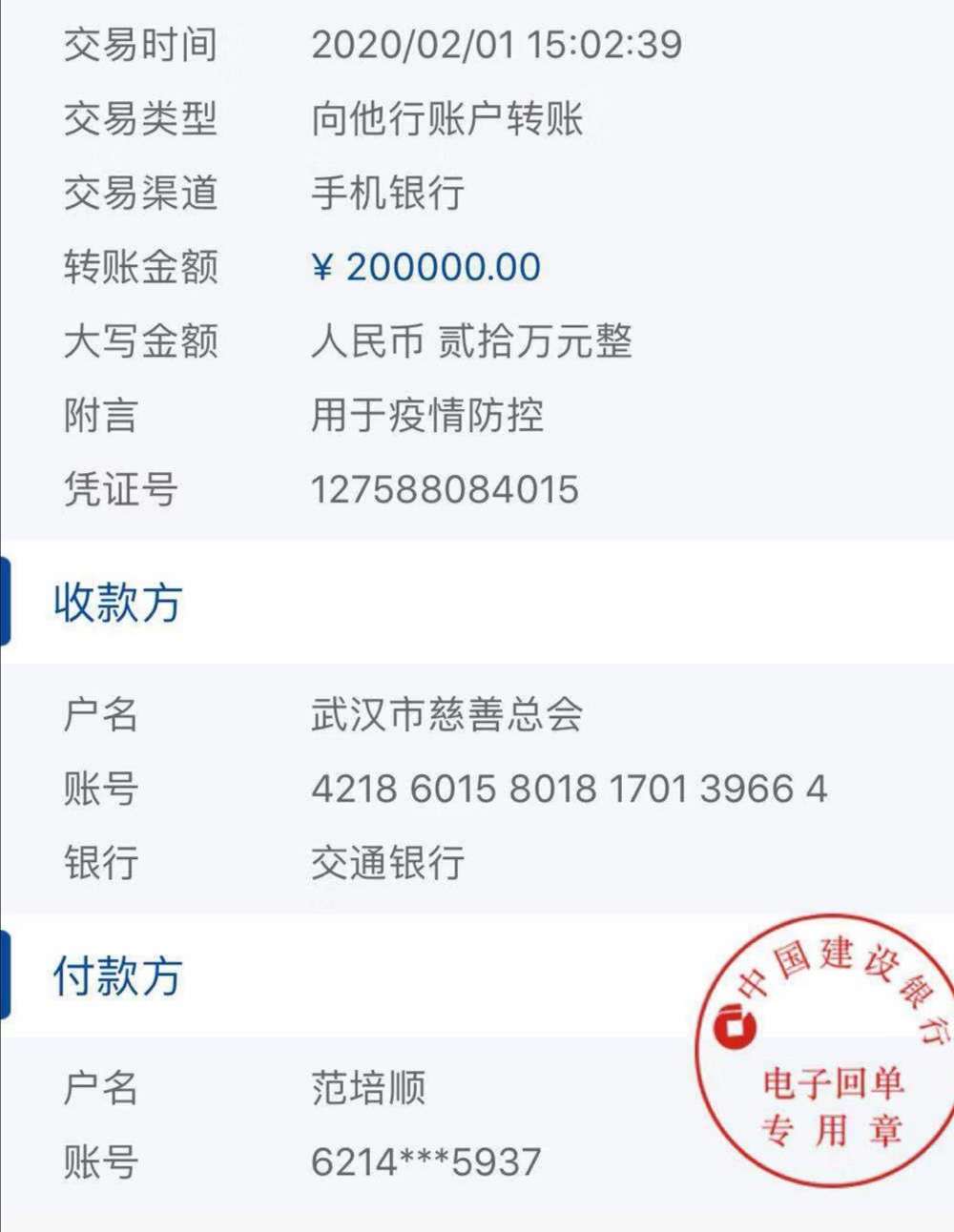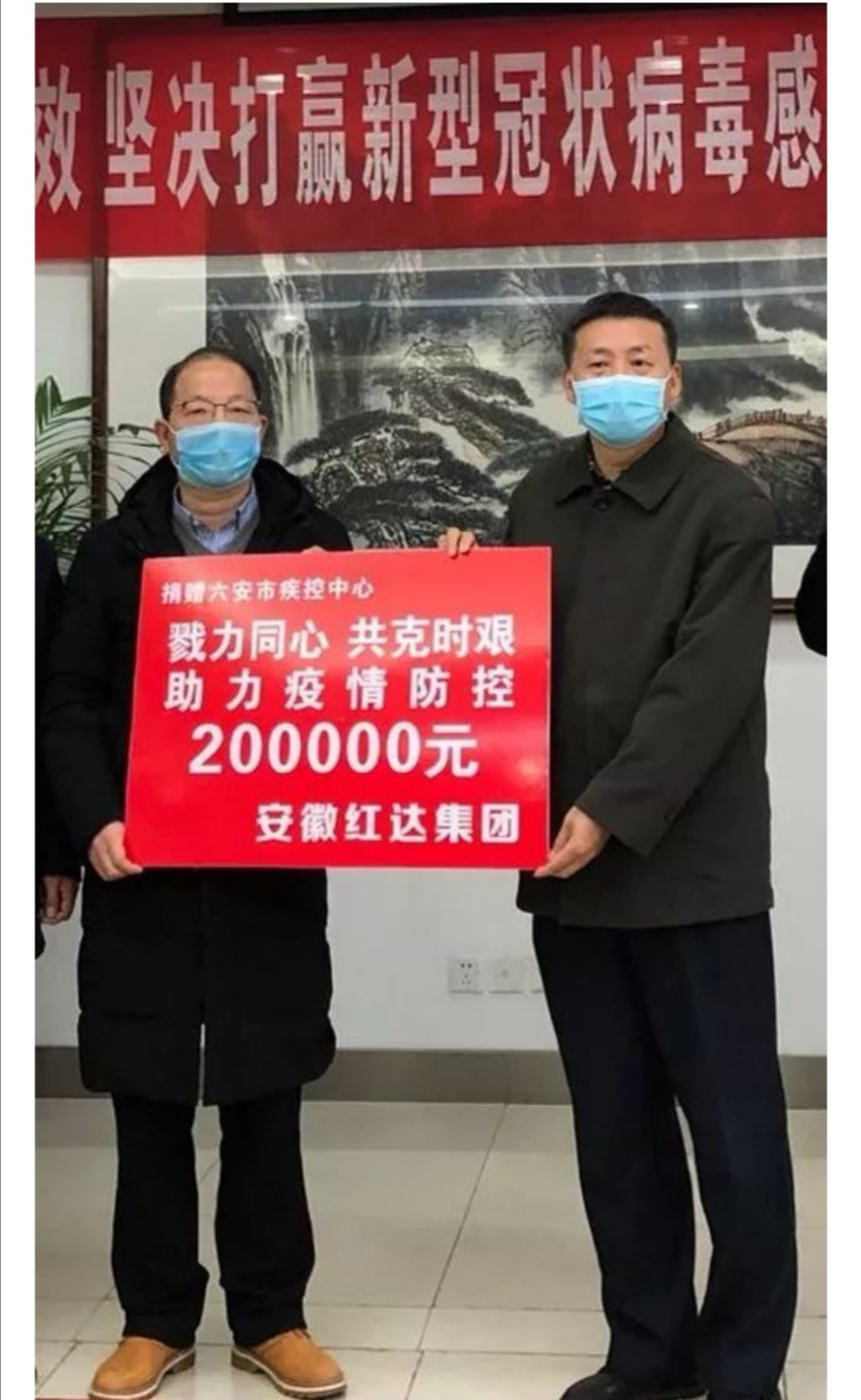 1月31日和2月1日,安徽省皖西南经济发展促进会常务副会长单位,安徽红达集团向六安市疾控中心捐赠疫情防控专项资金20万元;安徽六安恒基伟业智能家居有限公司董事长范培顺通过中国建设银行向武汉市慈善总会捐赠20万元。