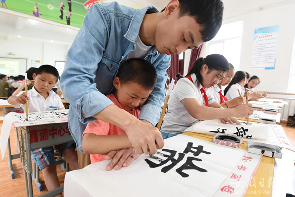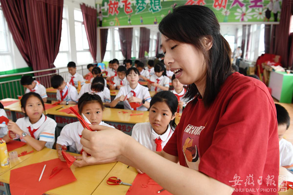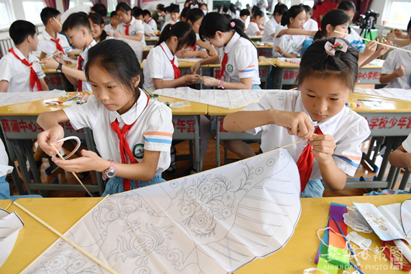 6月19日,安徽向日葵公益助学服务中心联合合肥经开区社会发展局团委青年志愿者,走进岳西县菖蒲镇辅导小学,开启“传承传统文化 端午爱心助学”文化之旅,与山区孩子面对面交流书法、剪纸艺术,并共同绘制纸鸢欢度端午。同时,主办方还为该校捐赠了笔墨纸砚和书法作品,并走访了部分特困学子,为他们每人送去一份节日礼物和1000元爱心红包。(安徽日报 记者 徐?F昊 摄)