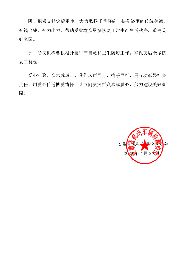 安徽省机动车辆检测协会关于积极开展抗洪救灾活动的倡议书