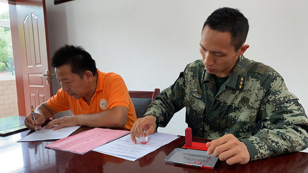 协会会长谢尚斌(左)和武警机动中队代表签署军民共建合作协议(姜雪芹 摄)