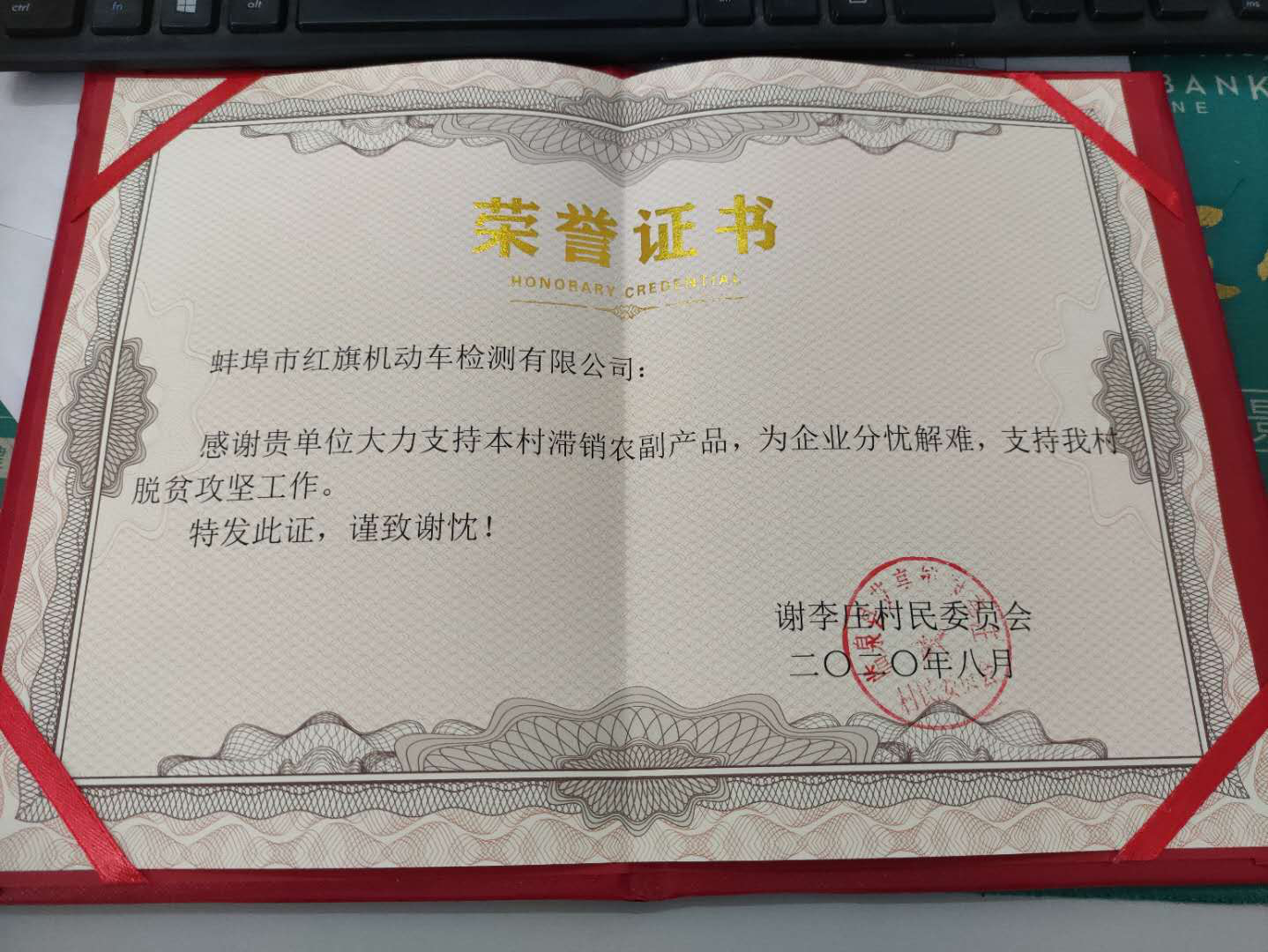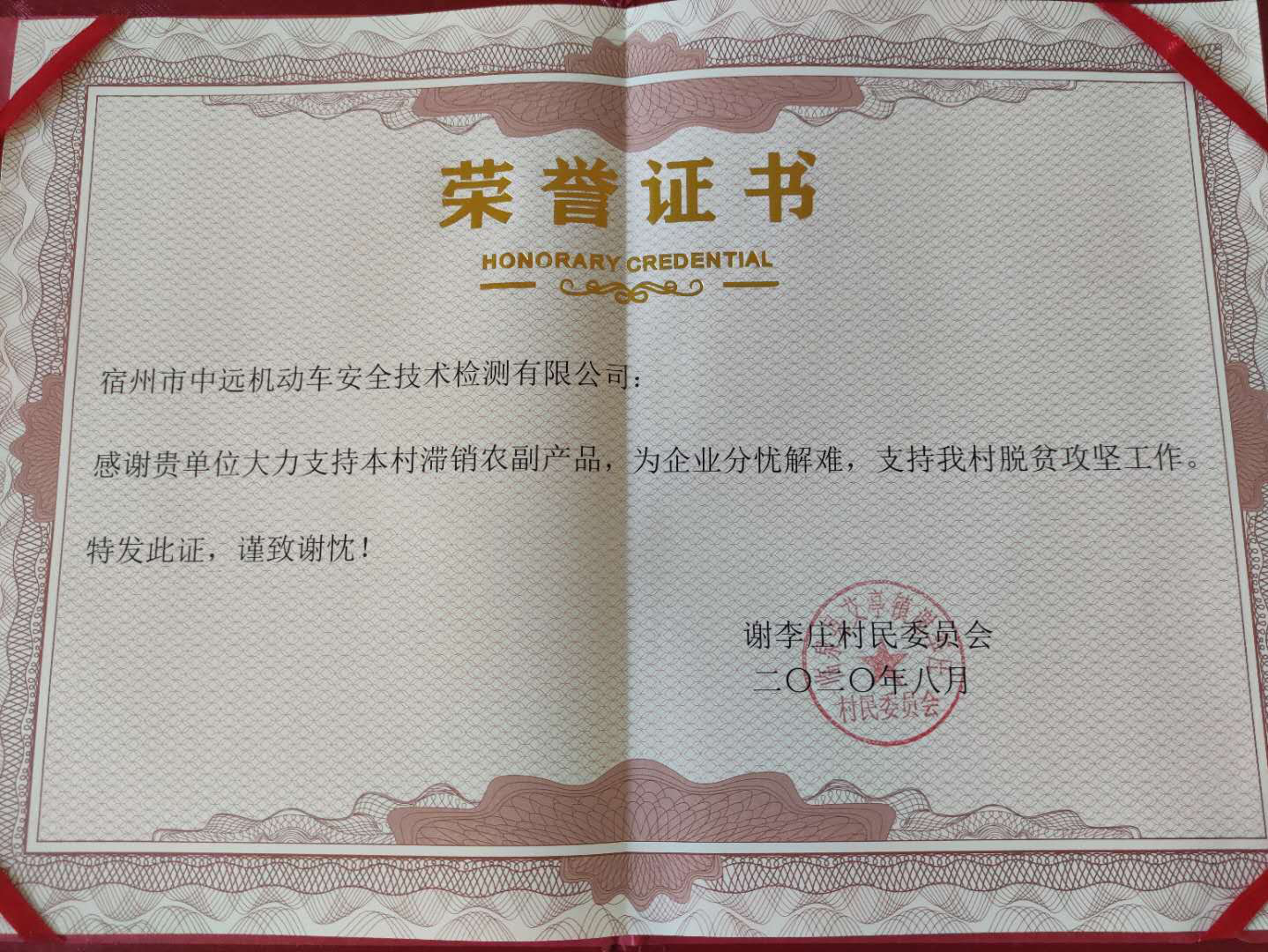 近日,安徽省机动车辆检测协会副会长单位深圳大雷汽车检测有限公司、宿州中远机动车安全技术检测有限公司和监事长单位蚌埠红旗机动车检测有限公司先后收到协会定点扶贫村—阜阳市临泉县艾亭镇谢李庄村委会寄来的荣誉证书,感谢他们大力支持销售该村滞销的农副土特产品菊花,为企业分忧,为?贫攻坚助力。