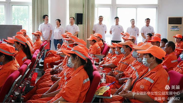 安徽新华女性公益发展中心理事长上台致辞。她说9月5日是全国第五个“中华慈善日”。关爱环卫工人主题公益活动今天已举办第二场,从身边的“小善”做起。仁者爱人,乐善好施中华民族历久弥香的慈善文化,从来不乏闪耀的思想与慷慨的给予;这个世界的每个角落、每时每刻都发生正能量的故事;而大爱,正是由各种无微不至、无处不在经年累月的小爱累积而成的;愿向善的力量照亮众人。愿公益的爱心为“城市美容师”带去生活与工作的力量,也送去高温下最舒适的清凉。