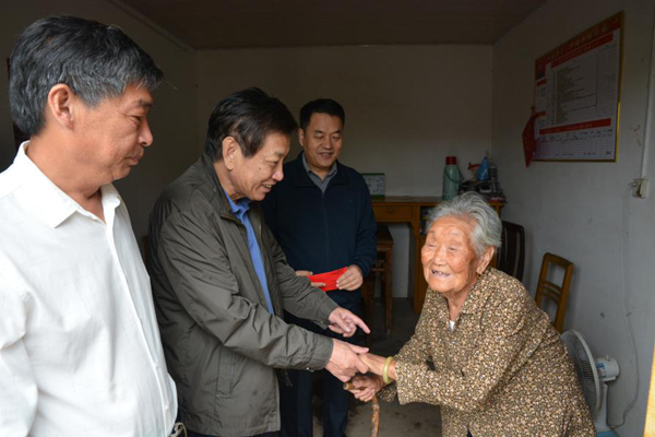 9月17日一早,沈会长一行便来到颍上县鲁口镇叶桥村,冒雨前往贫困户李玉华家中慰问。村民李玉华年逾93岁高龄独自一人在家,孩子多种残疾导致家庭贫困,生活十分艰苦。沈会长细心询问老人的健康和生活情况,鼓励她保重身体安心生活,并向她捐赠了省协会秘书处个人捐款1000元。随后,沈会长一行前往叶桥村村委会,与当地乡镇干部交流座谈扶贫工作。沈基明会长指出:这次慰问走访活动,旨在进一步落实“百社进百村”助力脱贫攻坚行动方案,帮助解决结对村及贫困户的工作、生活困难。省协会根据调研,确定了产业扶贫和公益扶贫的路子。这次走访,秘书处和企业家们带了慰问金表表心意,阜阳市个私协会将为村里农经作物的商标注册和品牌提升把好关、服好务。下一步,我们将根据民政厅的统一安排,进一步发挥系统优势,持之以恒地为村里的发展做一些实实在在的事情。