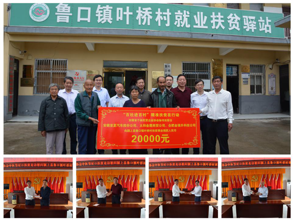 会上,陆杰武秘书长代表省个民协会秘书处,与省个民协会副会长单位、太和县金鹰商贸公司王平义董事长和亚夏汽车股份有限公司周晖总经理,省个民协会理事单位、合肥金强升科技发展有限公司葛敬高总经理联合向叶桥村扶贫事业捐款共计2万元。
