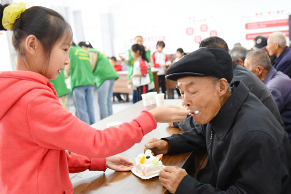 爱心送进光荣门 情暖老兵--同手绘祝福。十多名孩子们拉着老兵们的手,在两米长的中国人民共和国成立71周年生日蛋糕上,由爱丽诗烘焙专业师傅指导插上鲜花、摆上水果,写下对祖国的祝福——“迎中秋、庆国庆”。