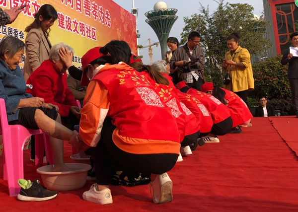 10月19日,学生志愿者团队和专业志愿者团队开展文化演出和为老人洗脚的志愿服务活动。阳光使者志愿者们表演的豫剧《抬花轿》、现代小品《养老》、歌曲《母亲》等节目,感染了在场的每一个人,动感的音乐,欢快的舞步,灿烂的笑脸,赢得了大家阵阵掌声。