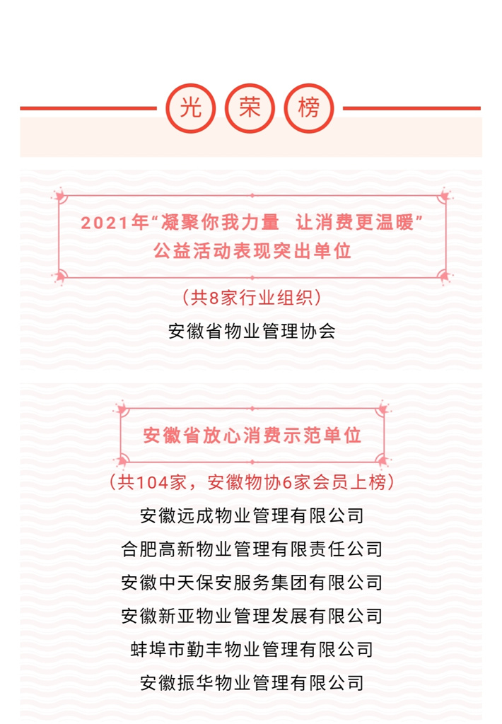经各市级放心消费示范单位自愿申报、市级消保委初审推荐,省消保委依据相关工作程序,认定104家单位为“安徽省放心消费示范单位”。作为物业行业代表,安徽物协6家会员企业获此殊荣。这既是省、市消保委和全省各界对物业行业的充分肯定,也是我省物业行业加强行业自律、维护行业生态取得的重要成果;既是6家企业的光荣,也是全省物业行业的骄傲!
