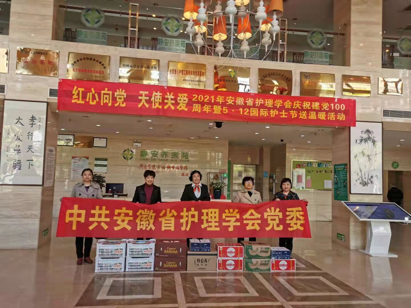 2021年4月10日,中共安徽省护理学会党委在武义华书记的带领下,赴安徽静安养亲苑开展庆祝建党100周年暨5.12护士节送温暖活动,本次活动主题为“红心向党·天使关爱”。中共安徽省护理学会党委给孤寡老人们送去食品等其它物资。