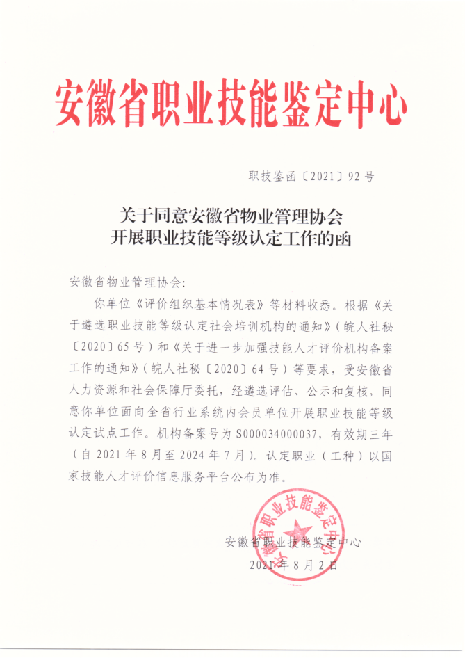 8月2日,省职业技能鉴定中心发文,同意安徽省物业管理协会面向全省物业行业系统会员单位开展职业技能等级认定试点工作,这标志着我省物业管理行业从业人员职业技能等级认定工作从此有了平台和支撑。