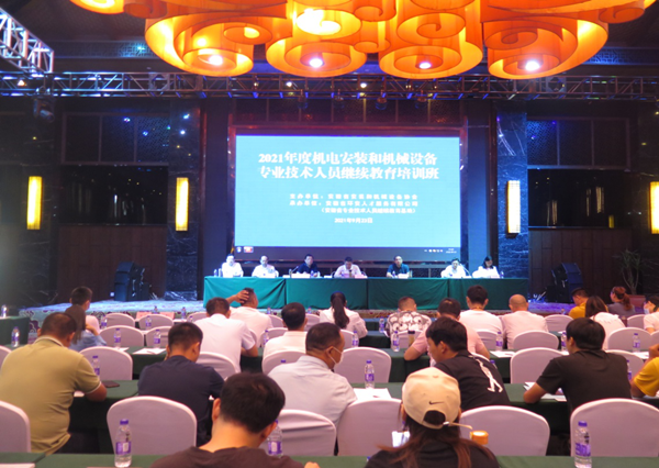 9月23日-25日,2021年度机电安装和机械设备专业技术人员继续教育培训班在池州顺利举办。培训由安徽省安装和机械设备协会主办、安徽省环安人才服务有限公司(安徽省专业技术人员继续教育基地)承办。安徽省人社厅专技处二级调研员司永纯、池州市人社局专技人员管理科科长章和平、协会会长王军邦、副会长李鹏飞、秘书长杜庆梅、安徽省工商联职评办副主任王孝华、安徽省环安人才服务公司总经理叶松和来自全省近100家会员单位的300余名学员参加了开班典礼。