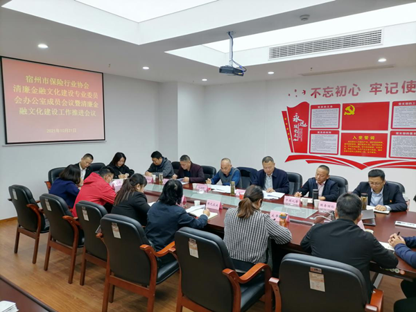 会议学习了《宿州监管分局关于深入推进宿州市银行业保险业清廉金融文化建设的通知》(宿州银保监发〔2021〕7号)和《宿州市保险行业协会清廉金融文化建设专业委员会工作规则》,通报了清廉金融文化建设专业委员会成立以来工作开展情况,交流了清廉金融文化建设工作经验。