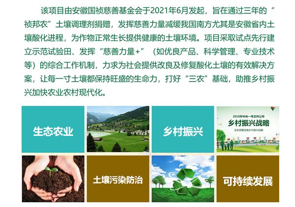 乡村振兴、生态环境保护、土壤污染防治等等一系列社会需求推动着基金会该项目持续发力,我们期望用三年的时间专注做一件事情,即为社会提供一个改良及修复酸化土壤的有效解决方案,让健康的土壤成为中国乡村农业强、农村美、农民富的重要财富。