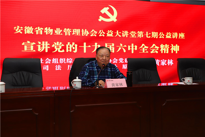 12月11日上午,安徽省物业管理协会公益大讲堂第七期公益讲座在合肥开讲。省社会组织综合党委派驻协会党建指导员、省司法厅离退休处原处长黄家林,结合个人学习理解,深入解读党的十九届六中全会精神及《中共中央关于党的百年奋斗重大成就和历史经验的决议》等文件。课堂严格执行疫情防控措施,来自省直机关及部分市物业行业主管部门的领导,以及协会功能型党支部党员、协会理事以上单位负责人、特邀代表等,共220人现场聆听授课。
