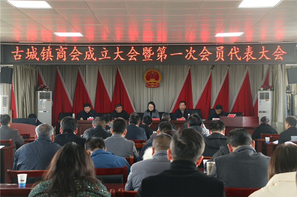 在古城镇召开商会成立的大会上,县政府副县长马卷舒、县工商联、县民政局、古城镇党委政府等单位负责人以及来自全国各地(以省内为主)的61名企业负责人出席成立大会。大会审议通过了《古城镇商会章程(草案)》、《选举办法(草案)》,选举产生了以郭万东为会长的10人商会理事会。“倾听乡音,沟通亲情,发挥商会的娘家作用;制定制度,建立机制,推动商会规范运行;服务会员,维护权益,提高商会运作质量”,新当选的商会会长郭万东以简短的方式规划了商会助推古城经济发展的愿景。副县长马卷舒在充分肯定古城镇近年来经济发展的成果的同时,对新成立的商会给予厚望:进一步加强商会组织建设。致力于依法、依规、依章程地广泛开展商会活动,用活动锻造商会,不断增强商会的生机与活力。积极发挥商会功能作用,要在开展行业协调自律、组织会员参加经济交流座谈会、展销会、维护正当权益等方面坐实工作,充分发挥“平台”、“后台”、“港湾”和“桑梓”作用,关心支持家乡发展,走好高质量发展之路。