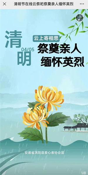 今年清明节来临之际,由于新冠肺炎疫情防控需要和涡阳县疫情防控文件要求的原因,无法再像往年一样组织开展线下扫墓活动。为了学习革命先烈永垂不朽的精神,为了发扬传承革命先烈的英勇事迹和遗志,涡阳爱心者协会今年采用线上缅怀的活动方式,用H5场景活动链接页面祭奠先人,缅怀英烈,弥补无法到扫墓现场祭拜的遗憾。为了在疫情防控期间带动更多的人参与网上文明祭祀,涡阳县爱心者协会全体会员把H5场景活动链接转发到微信群里和各自的朋友圈中。点开链接,播放着祭奠先烈的音乐,在线上扫墓活动页面链接中,大家纷至沓来,在页面留言栏里,纪念思语,说上一段话,送上一束电子鲜花等虚拟祭奠物品,缅怀先烈,寄托哀思。