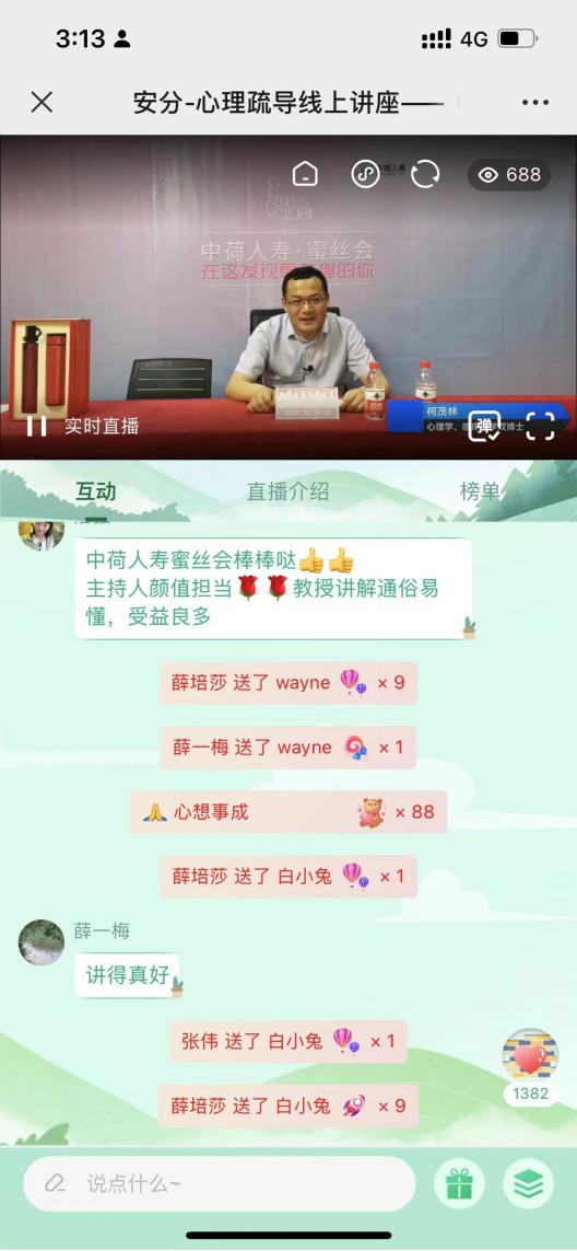 5月15日下午,安徽省现代心理学研究院名誉院长,省武警总部心理危机干预专家组成员柯茂林博士受中荷人寿蜜丝会安徽分会特邀,开设了首场“阳光心态,幸福人生”心理疏导线上讲座。针对内外勤员工、家属与客户在特殊时期的心理状态,进行分众化、具象化的心理调适和心理抚慰,近700位蜜粉热情高涨的参与本场讲座。