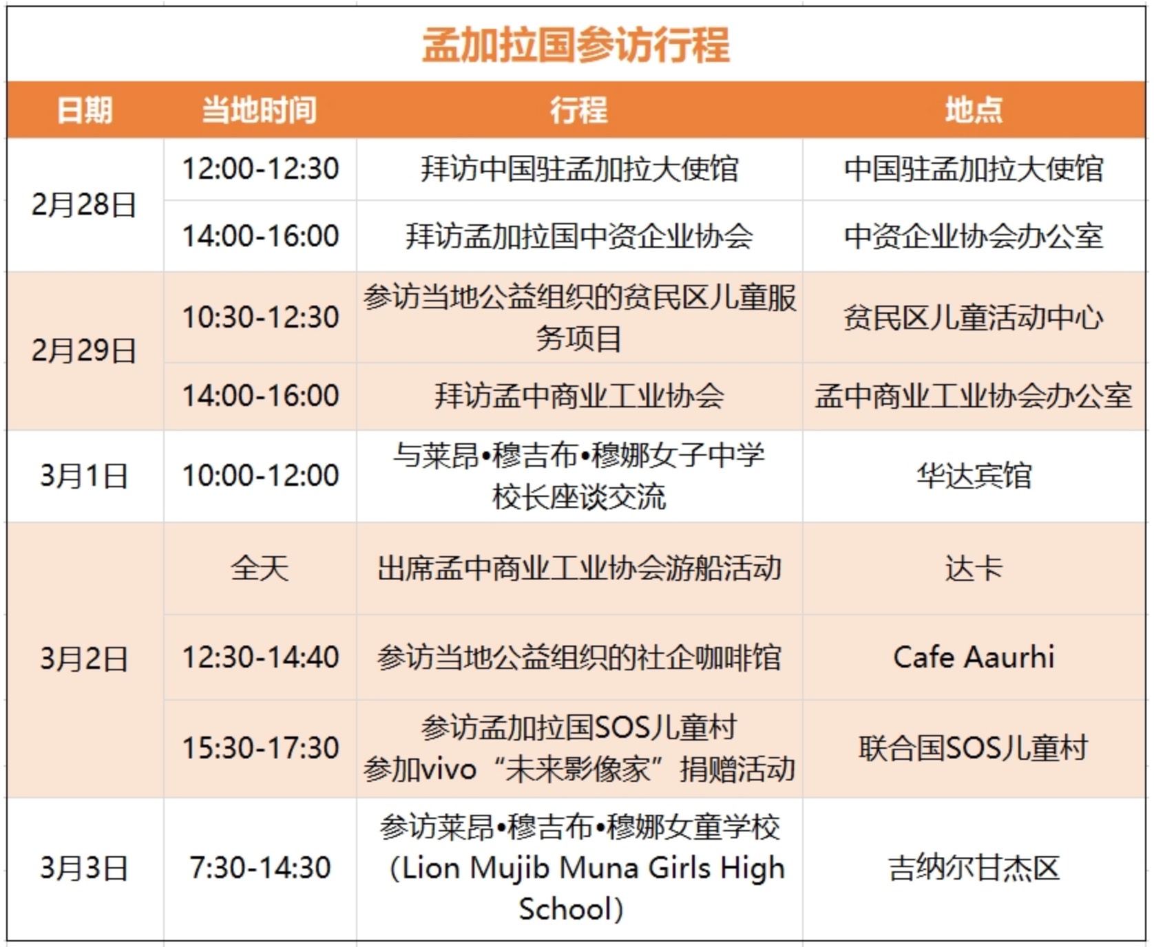 为探索面向海外慈善领域持久有效的帮扶模式,2024年2月28日—3月3日,安徽美善公益基金会理事长张玲携团队一行五人,前往孟加拉国进行公益考察交流。本次行程先后拜访了中国驻孟加拉大使馆、孟加拉国中资企业协会、孟中商业工业协会,并参访了联合国SOS儿童村、Lion Mujib Muna女童学校、当地公益组织在贫民区开展的儿童服务项目及其社会企业,还参加了vivo的“未来影像家”捐赠活动。考察中,美善基金会与当地协会代表、中方企业代表及公益伙伴进行交流,多角度了解孟加拉社会发展及公益服务状况,为将来公益项目在孟落地奠定基础。