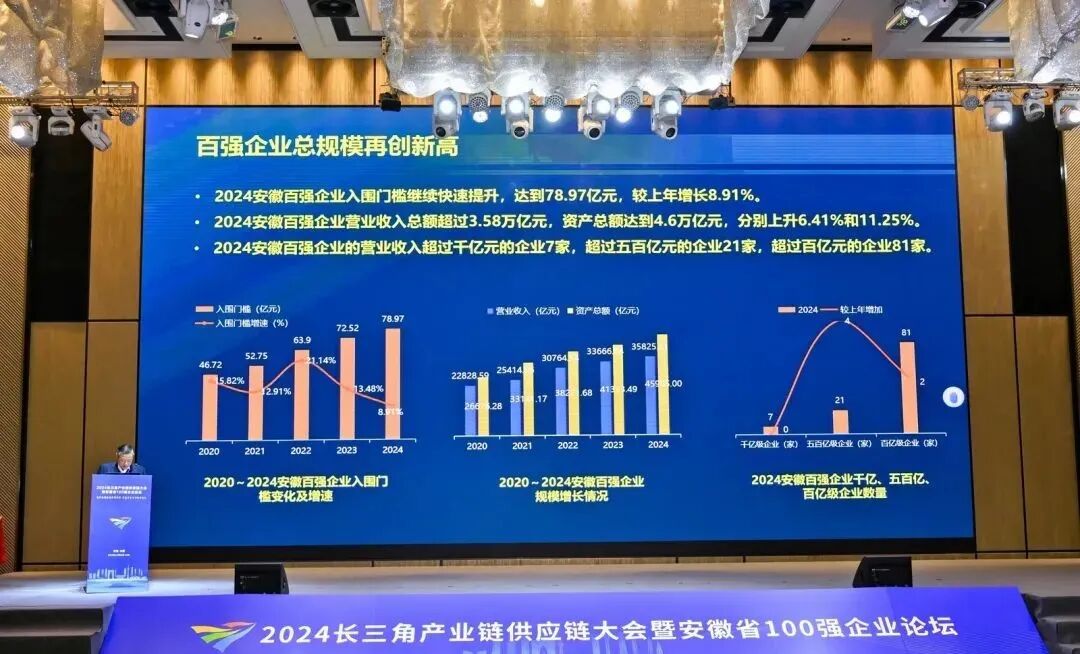 在全国上下学习贯彻党的二十大和二十届三中全会精神,安徽人民深入学习习近平总书记考察安徽的重要讲话精神,积极培育发展新质生产力,加快构建现代化产业体系的重要时刻,安徽省企业联合会、企业家联合会在中国企业联合会、企业家协会的指导下,联合长三角三省一市企联、中关村中慧先进制造产业联盟在“养人福地,创新高地”合肥隆重召开以“发挥百强引领作用 打造有竞争力的产业链。”为主题的“2024长三角产业链供应链大会暨安徽省百强企业论坛”。