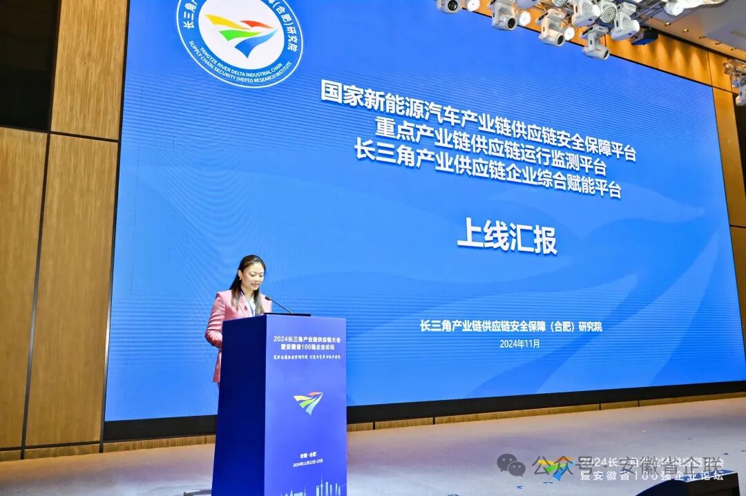 会上,由合肥市人民政府倡议并指导支持、以建设长三角产业链供应链指挥调度系统和长三角产业链供应链安全保障平台,维护产业链供应链重点领域安全为中心工作的新型智库性研发机构“长三角产业链供应链安全保障(合肥)研究院”成功揭牌。长三角产业链供应链安全保障(合肥)研究院陈玉涛院长就“国家新能源汽车产业链供应链安全保障平台、重点产业链供应链运行监测平台、长三角产业供应链企业综合赋能平台”做了详细的介绍讲解。