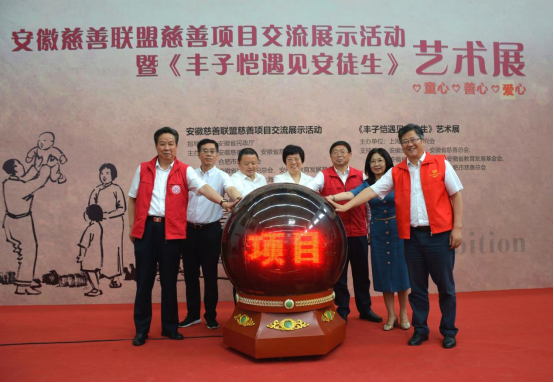 6月1日上午,安徽慈善联盟慈善项目交流展示活动暨丰子恺遇见安徒生艺术展在合肥骆岗公园开幕。省慈善总会会长刘莉、省慈善总会常务副会长张冬云、省民政厅副厅长张振粤、省社会组织总会会长贾宝明、省教育发展基金会理事长王佩刚、省文旅厅二级巡视员海燕、上海丰子恺研究会会长丰羽共同启动开幕球。